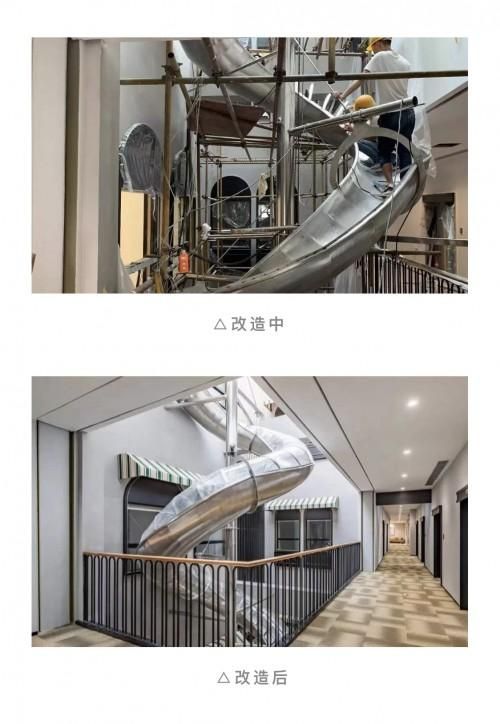 因为建筑原有的复杂线路和现今高难度的施工要求,施工队与设计师整日磨合。从天花布管到滑梯安装,从审图纸到频繁送样,就是这么细致又精准的推进建设工程在2019年10月9日,提前完成了C级验收,将一个还原度极高的空间呈现了出来。