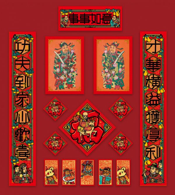 事事如意新春礼包是基于佛山木板年画的创作成果,充分将年轻人的“潮”文化注入了传统的祈福文化、粤语文化,产品包含事事如意春联套装、佛山门神贴、四小一大“福”及五个红包。其中,佛山木版年画中的门神被用于红包封面时,一改过去严肃庄重的守卫形象,演绎出手持大刀开怀大笑、带上黑框眼镜畅游书海、竖起大拇哥点赞美食等各种俏皮形象,并融入“鼠你有财”、“财识兼收”以及粤语“掂过碌蔗”等吉祥话。这种创意设计将传统年画文化与现代年轻人的潮趣生活融为一体,让人耳目一新。目前,这款春联礼包与河南开封木板年画春联礼包、天津杨柳青木板年画春联礼包均正在新新精艺京东自营旗舰店热销中。