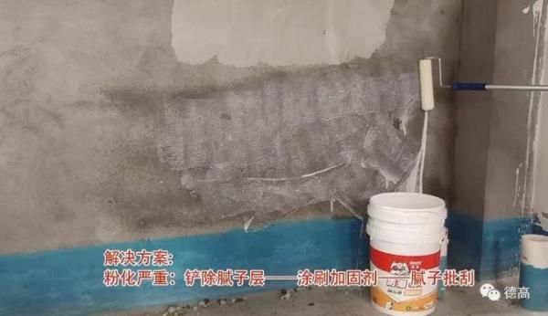 若出现轻度掉粉,则可以用湿毛巾将浮灰处理掉,然后用加固剂进行界面处理再批刮即可。若粉化严重,则建议铲除后用加固剂做界面处理再进行批刮。