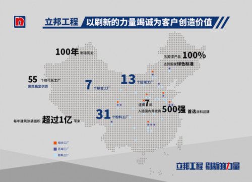 在与合作伙伴长期的战略合作中,立邦始终坚持以客户需求为中心,致力于为客户提供全方位整体解决方案,不断创新,整合服务资源,高标准、高效率地助力客户达成高质量的项目效果。截至目前,立邦已在全国多个城市开设了55家工厂,并加快了绿色智能工厂的建设,在提升生产品质的同时,保障稳定供货,提升生产效率,实现客户的快速交付。