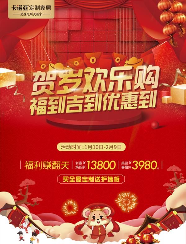 离农历新年越来越近,卡诺亚本着精工匠心,点亮了春节不打烊的PLUS福利,1月10日-2月9日期间为业主朋友们准备了“贺岁欢乐购·福到吉到优惠到”的新年开运大礼,包括全屋定制仅售¥13800/套再送护墙板、厨房¥3980/套起、付定金增值¥50/天等,诚意为消费者送来最后一波福利,2020年继续延伸“安醛居家,健康无价”的新生活,绽放“空间定制”的家居整体解决方案之美。