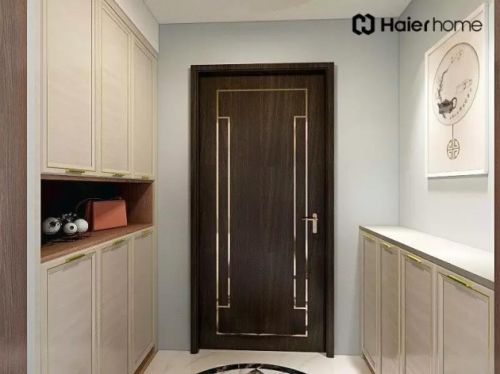 ▲玄关:卡斯楠胡桃木门板辅以金线设计,典雅大气,与珐琅浅灰相互映衬,深得业主喜爱。两侧的高低鞋柜靠墙而立,提供了强大、多样化收纳空间的同时,也拉伸了视觉的纵深感。