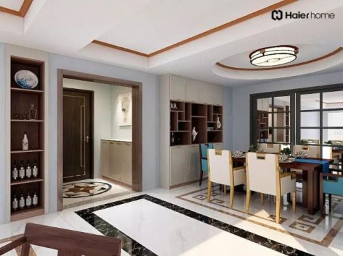 针对王先生夫妇提出的需求,以及王太太的特殊情况,设计师为其推荐了海尔全屋家居的S03款兰斯系列定制产品,整体展现风格以新中式为主。