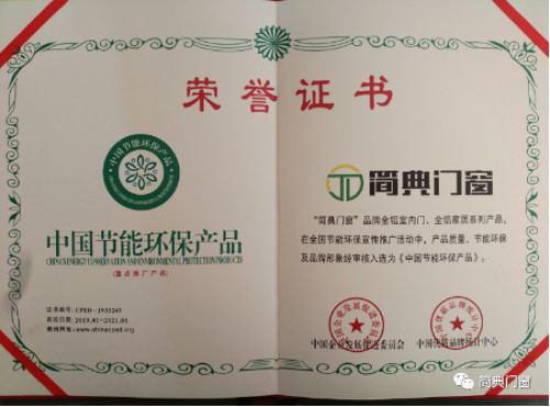 简典门窗品牌全铝室内门、全铝家居系列产品,在全国节能环保宣传推广活动中,产品质量、节能环保及品牌形象经审核入选为《中国节能环保产品》,这是有关部门对简典全铝室内门产品质量与品质的认可,并被评为《AAA级诚信经营示范单位》。