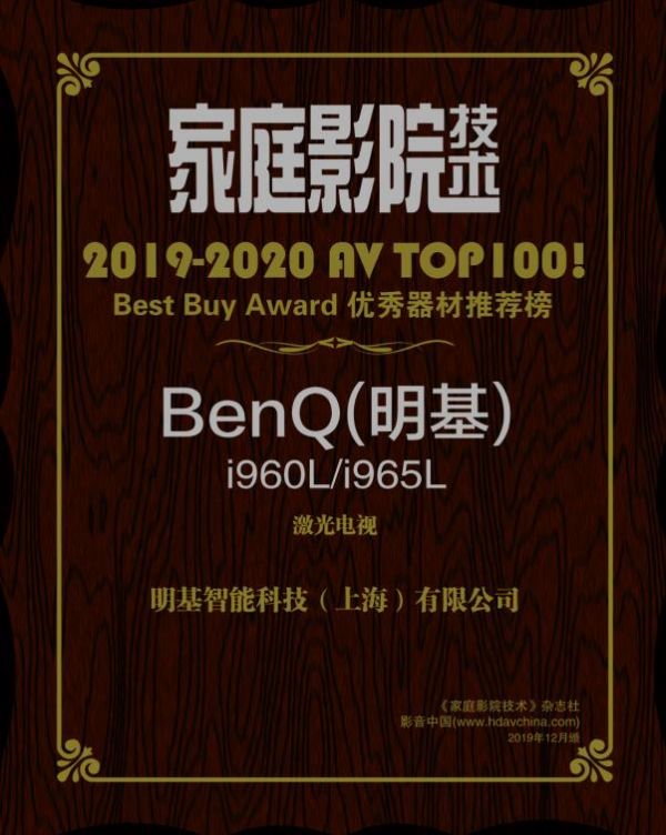 画质提升,也让明基激光电视获得四家专业影音媒体的肯定,拿下《家庭影院技术》的「优秀器材推荐奖」,投影时代「年度优秀品牌奖」,登上数字家庭「2019年十大科技潮品」以及影音新生活「2019年度推荐产品」。其中,资深影音杂志《家庭影院技术》这样评价明基激光电视,这 “并非最初登录家用市场的4K激光电视,是蕴含着成熟与沉稳味道的全新力作”。