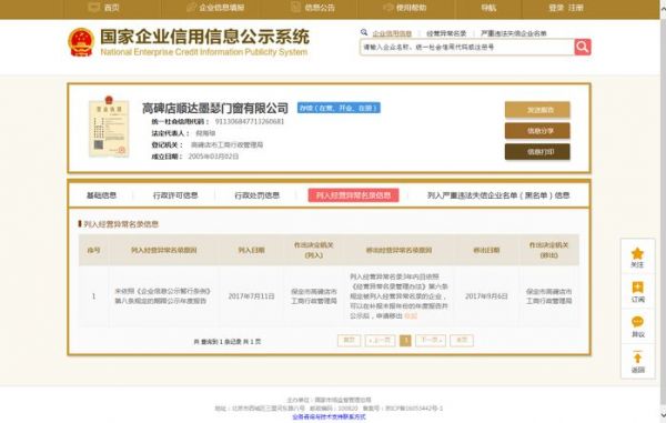2017年7月11日,高碑店顺达墨瑟门窗有限公司因未依照《企业信息公示暂行条例》第八条规定的期限公示年度报告而被保定市高碑店市工商行政管理局列入经营异常名录信息用。2017年9月6日,高碑店顺达墨瑟门窗有限公司申请移出,因符合列入经营异常名录3年内且依照《经营异常名录管理办法》第六条规定被列入经营异常名录的企业,可以在补报未报年份的年度报告并公示后,可以申请移出。