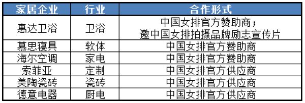 据统计,截至目前,中国女排的合作商数量达到20家,包括官方合作伙伴、官方赞助商及官方供应商。在这20家商家中,家居相关品牌占据了6席,分别为惠达卫浴、慕思寝具、海尔空调、索菲亚、美陶瓷砖和德意电器。近三分之一的占比也进一步说明了家居企业对于体育营销趋势的重视和积极布局。