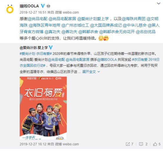 在新的一年里,噢啦也将继续坚持“以废代捐”的环保新模式,联合爱尚计划项目继续携手开展环保回收合作,号召更多的人参与环保公益事业,为社会带来更多的正能量,帮助更多的小朋友们温暖过冬~