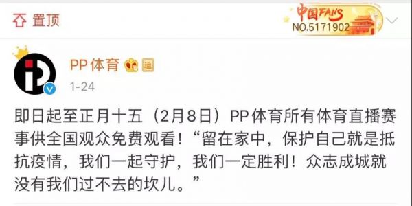 我不会告诉你:即日起至正月十五(2月8日),PP体育所有体育直播赛事供全国观众免费观看!
