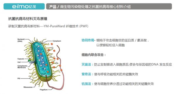 以YM-PuraWard 纤维技术 (PWF)为例,抗菌、抗病毒的核心技术是银离子和铜离子协同作用。 铜精于攻击细胞壁的蛋白质 / 氨基酸,以便银轻松侵入细胞。其中,通过灭菌法防止复制银进入细胞质后,便会与基因组的DNA 发生反应;通过窒息法使与呼吸功能相关的关键酶失效;通过饥饿法使与细胞壁养分透过功能相关的关键酶失效。抗菌抗病毒过滤材料已通过美国和欧盟多国实验室检测,SARS病毒平均减少率99.58%,H1N1病毒平均减少率99.91%,H7N9病毒失活率99.98%,大肠杆菌抗菌率99.96%。将材料制作成口罩送检,通过了美国FDA和中国广微测双认证,抗病毒活性成效显著。
