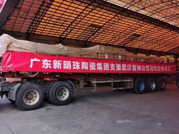新明珠陶瓷集团第一时间与工程项目方中建三局雷神山医院的项目建设单位取得联系,经过详细了解,决定马上提供一批建设比较紧急的瓷砖产品,用于雷神山医院卫生间的铺贴。疫情就是命令!今天一早接到集团命令,两辆大货车在新明珠三水园区建陶一分厂成品二仓火速完成装车,目前已经驶离佛山,奔赴武汉抗疫第一线,预计明晚抵达!