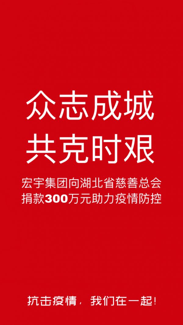 “一方有难八方支援,我们一定会战胜这次疫情!”面对这场防控阻击战,宏宇集团一直高度关注疫情发展,心系武汉、心系国情,以中华民族企业之勇担当,履行企业社会责任,众志成城共克时艰,同舟共济为社会民生保驾、为逆行者们护航。