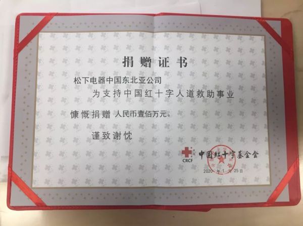 为全力援助武汉抗击新型冠状病毒感染的肺炎疫情,2020年1月25日,松下电器中国东北亚公司紧急向中国红十字基金会确认捐赠100万元人民币,用于购买医用口罩、防护服、护目镜等防疫物资。