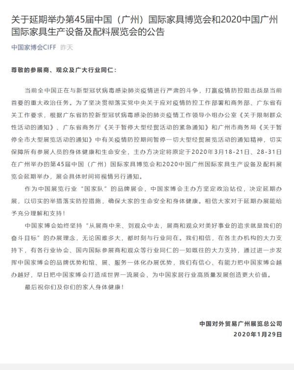 2020年1月30日消息,中国家博会CIFF发布公告,原定于2020年3月18-21日、28-31日在广州举办的第45届中国(广州)国际家具博览会和2020中国广州国际家具生产设备及配料展览会延期举办,展会具体时间将视情另行通知。