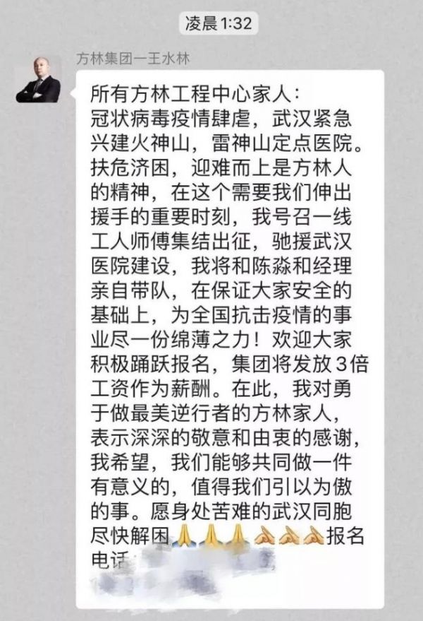 深耕建筑装修行业多年,王水林深知,此刻在建的雷神山医院亟需一线施工人员。于是,他想到挂帅带队,率企业一线工人师傅驰援雷神山医院建设,对报名参加人员给予安全防护保障和3倍工资待遇。