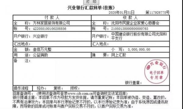 于是,1月31日上午,方林集团通过沈阳市民营企业家爱心慈善会,向武汉市、沈阳市定向捐赠300万元现金。