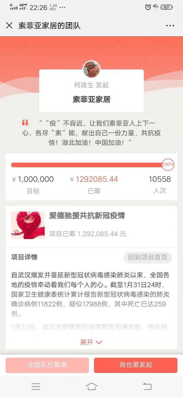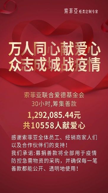 接受到大家的爱心信息后,索菲亚捐赠专项小组多方沟通和联系,并于2月1日,联合爱德基金会搭建了筹款渠道,向公司高管、内部员工、经销商及其员工以及主要合作伙伴发起募捐倡议!总裁柯建生作为本次募捐的发起人,十分重视此次募捐行动。为了激励更多的人加入这场善举,他承诺,善款每募集100000元,他便加捐3000元。言出必行,在募捐的30小时内,柯总时刻关注着数据的变化,10万…20万…30万…到最终定格在1292085.44元,柯总都能第一时间履行承诺,让“3000元”贯穿始终。此外,索菲亚公司领导班子和上百个经销商也纷纷作出表率,善款每募集100000元,他们就加捐100元、500元、1000元、2000元....积少成多,用自己的诚意呼吁更多人献爱心!