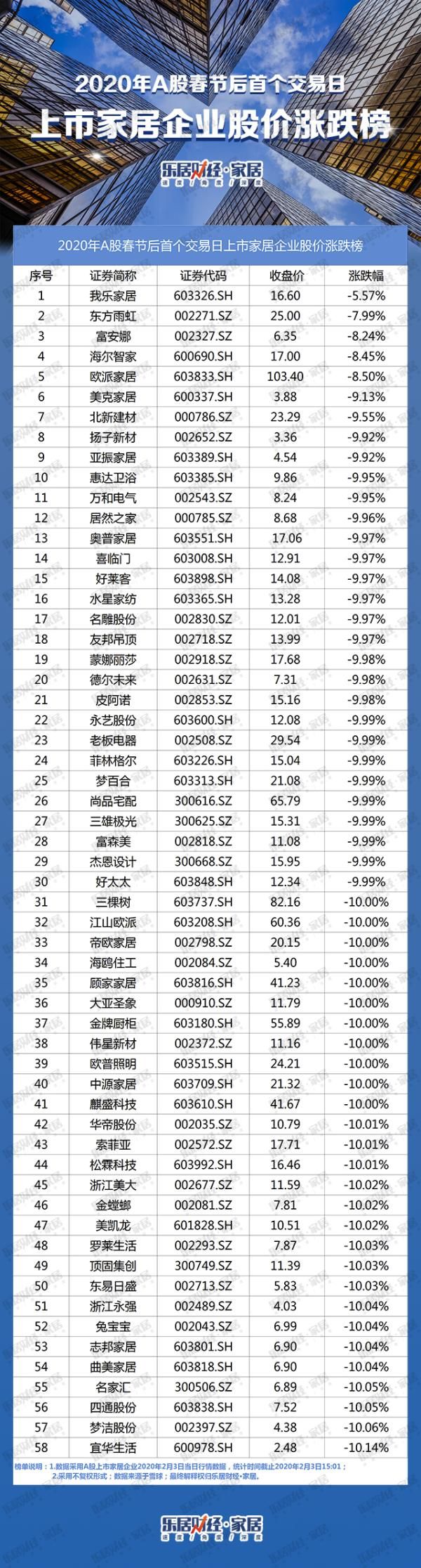 开市首日,乐居财经·家居统计了58家A股家居企业的收盘价和涨跌幅,截至收盘,58家A股上市家居企业全线下跌,53家股价跌超9%,其中51家跌停。仅我乐家居、东方雨虹、富安娜、海尔智家、欧派家居5家跌幅在9%以下。下跌幅度最小的是我乐家居,跌幅为5.57%,跌幅最大的是宜华生活,达10.14%。(作者:张华)
