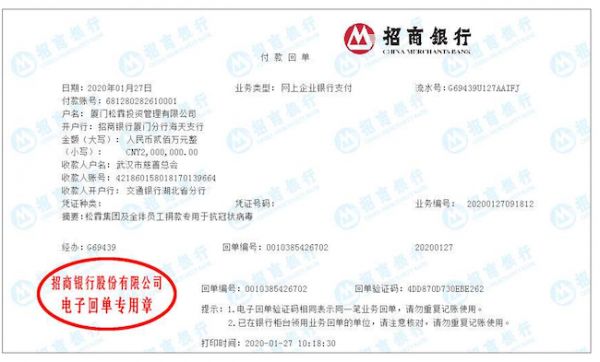 1月27日向武汉慈善总会捐赠200万元用于武汉前线抗击疫情及防疫工作。