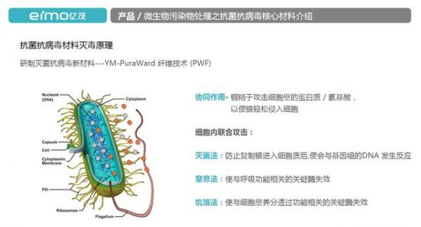 据吴龙涛介绍,抗菌抗病毒材料的应用,可尽最大可能防范细菌病毒的感染,并且更好的避免了二次污染。以YM-PuraWard 纤维技术 (PWF)为例,抗菌、抗病毒的核心技术是银离子和铜离子协同作用。 铜精于攻击细胞壁的蛋白质/氨基酸,以便银轻松侵入细胞。通过灭菌法复制银进入细胞质后,便会与基因组的DNA 发生反应;通过窒息法使与呼吸功能相关的关键酶失效;通过饥饿法使与细胞壁养分透过功能相关的关键酶失效,从而杀灭绝大部分病毒。