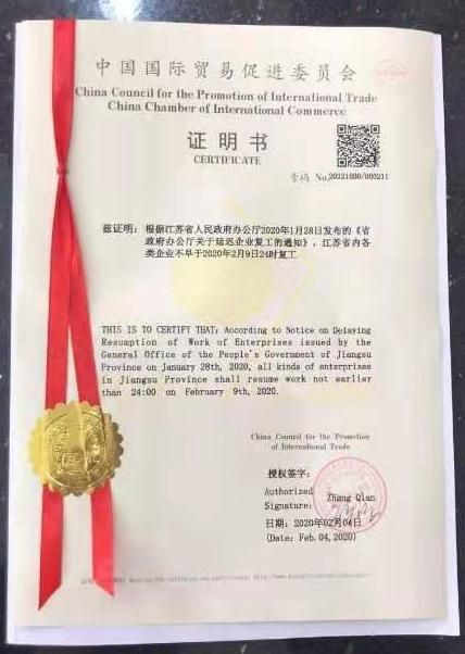 2月1日,该企业通过QQ工作群咨询办理不可抗力事实性证明的相关问题。2月4日上午,扬州市贸促会收到企业正式申请后,立即通过网络对文件进行初审。在中国贸促会、省贸促会等上级部门的指导和帮助下,扬州市贸促会成功出具全市首份新型冠状病毒肺炎疫情不可抗力事实性证明,并第一时间将证书的扫描件发给企业,目前该证书已通过快递邮寄给企业。