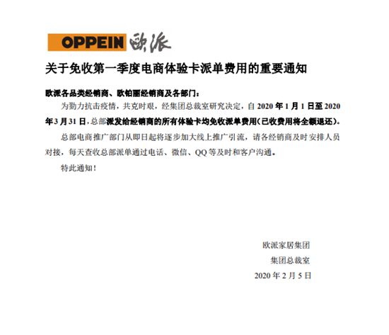 据相关人员透露,经欧派家居集团总裁室研究决定,自 2020 年1月1日至 2020年3月31日,总部派发给经销商的所有体验卡均免收派单费用(含欧派各品类和欧铂丽/含已收费用将全额退还)。