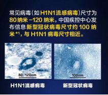 根据中国疾病预防控制中心病毒病预防控制所 1 月 24 日发布的信息:新型冠状病毒尺寸约为100纳米,与H1N1病毒尺寸相近(H1N1病毒尺寸为80-120纳米)。