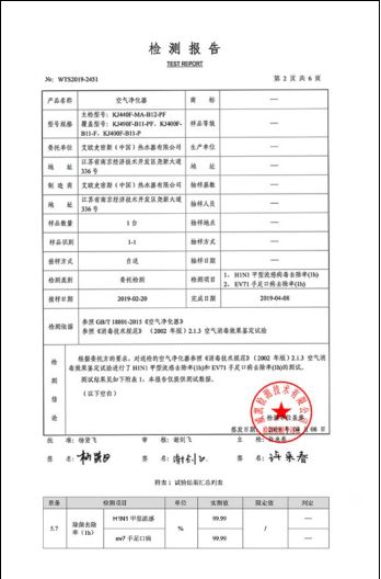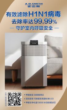 (配图为威凯检测结果:A.O.史密斯空气净化器滤除 H1N1 病毒达 99.99%)