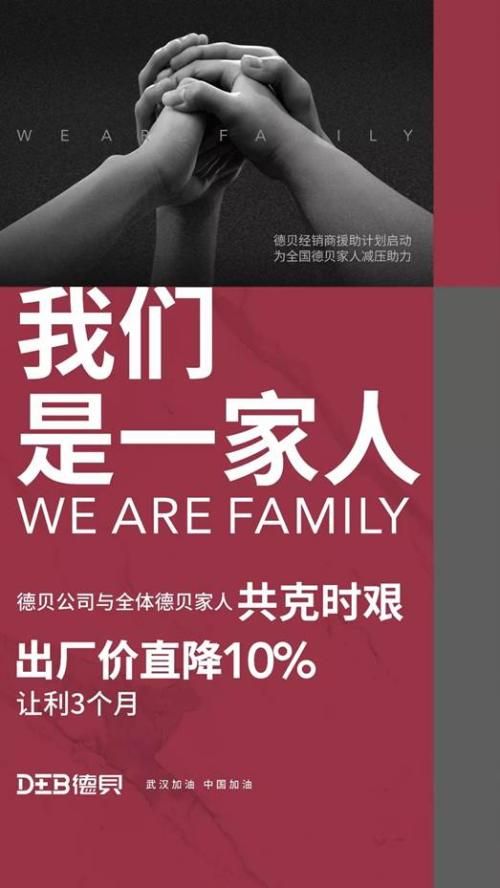 同时,德贝也在用实际行动与一线经销商同舟共济,共克时艰。2月6日,德贝全屋定制启动经销商援助计划,为全国德贝经销商减压。2020年2月6日,德贝全屋定制宣布让利3个月,产品出厂价直降10%,为全国经销商伙伴减轻压力,抵消新冠肺炎疫情可能带来的市场风险。