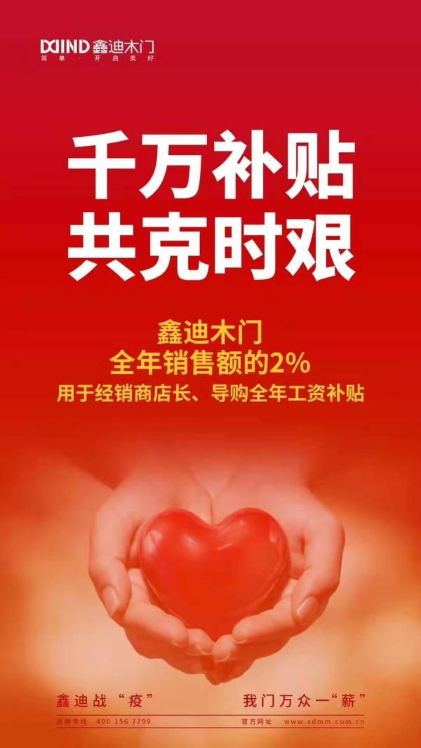 共克时艰!鑫迪木门宣布,将拿出全年销售额的2%用于经销商店长、导购全年工资补贴。在无情的病毒和疫情面前,家居人的温情相信会给行业带来信心的提振。