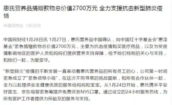 惠氏营养品:捐赠款物总价值2700万元 全力支援抗击新型肺炎疫情