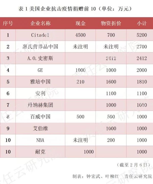 美国企业捐赠前10的企业分别是:Citadel、惠氏营养品中国、A.O.史密斯、GE、雅培中国、安利、丹纳赫集团、百威中国、艾伯维、NBA、耐克等。