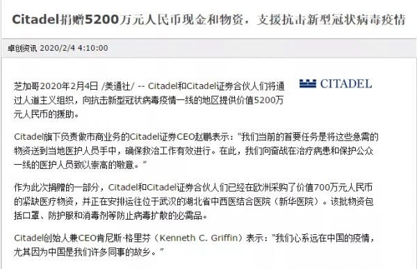 Citadel:捐赠5200万元人民币现金和物资,支援抗击新型冠状病毒疫情