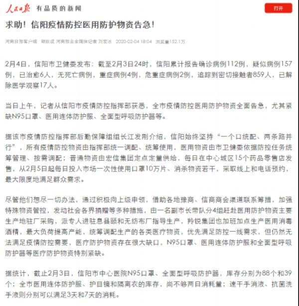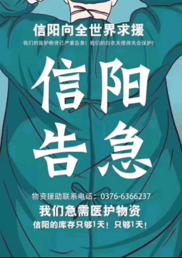 据早前信阳市卫健委统计:截止2月3日,信阳市中心医院N95口罩、全面型呼吸防护器,库存分别为88个和39个;全市医用连体防护服、护目镜和隔离衣的库存,尚不够两日消耗量;速干手消液、抗菌洗手液则分别可以满足3天和7天的消耗,物资告急!至2月5日,信阳的医护物资库存只够1天,再次告急!