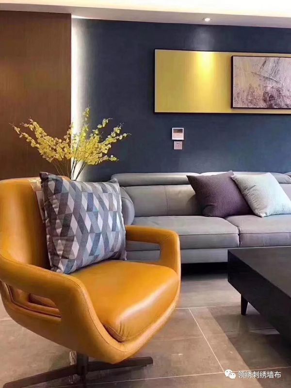 客厅墨绿色沙发背景墙搭配两幅现代感很强的装饰画,明黄的花卉盆景点缀,灰色皮质沙发和橘色的单人沙发,充满着现代摩登美,丰富了客厅的色彩。玄关的刺绣荷花提升了整个家的颜值与活力。总体设计以现代轻奢为主,色调加了一些浓重的色彩,有墨绿色和橙色,冷暖对比协调,显出几分端庄和优雅。小装饰是整个家居的小亮点,让家显得更有情调。