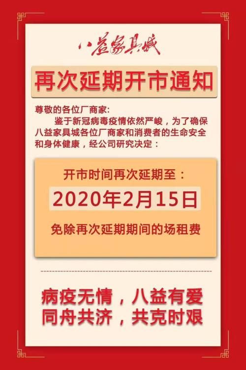 新浪家居2月7日讯八益家具城7日宣布,将开市日期推迟到2月15日,并免除再次延期开市期间的场租费。