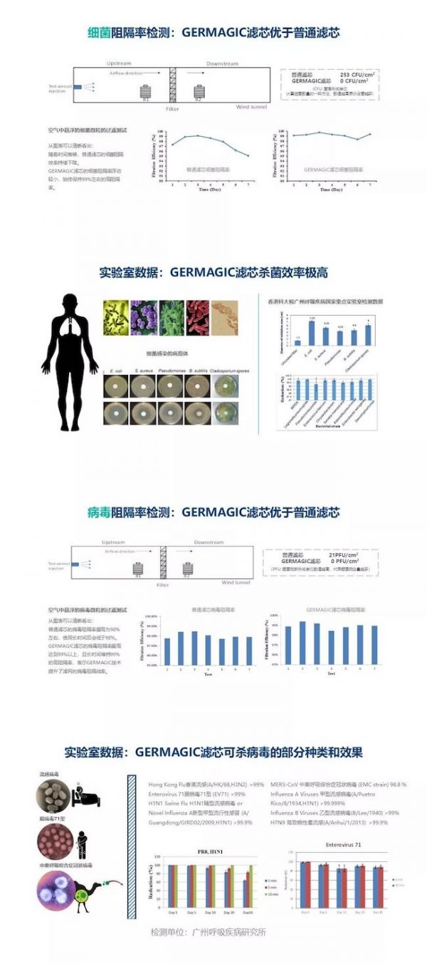 该产品区别于传统空净产品,拥有6重空气净化过滤系统。值得一提的是,过滤系统中采用了Germagic高效防疫复合滤网,该滤网拥有国际专利,滤网成分中的杀毒物质使细菌病毒成为失去活性和改变性质的物质,从而起到消杀病毒细菌的目的。该滤网经测试,开机一小时,即可对多项MERS-CoV 中东呼吸综合征冠状病毒、H7N9 、Enterovirus 71肠病毒71型(EV71)、甲型流感病毒和乙型流感病毒灭活率达98.9%以上,进一步保护奋战在疫情第一线的医护人员。