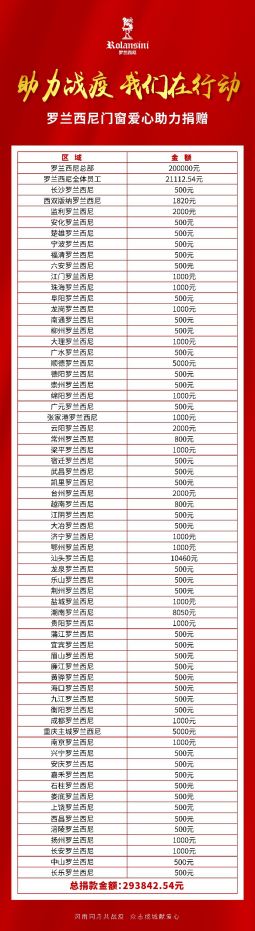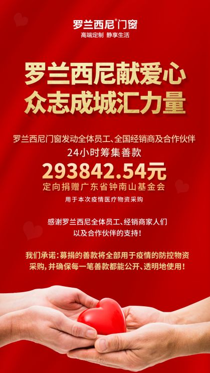 2月6日,罗兰西尼门窗呼吁公司高管、内部员工、经销商及其员工以进行捐款,短短24小时,共募集善款293842.54元。