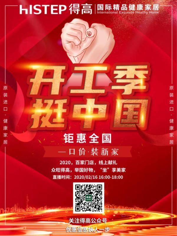 万众一心,精诚巨献。此次“开工季,挺中国”活动是得高首次联动全国,聚集百家店面,连通线上线下倾力打造的大型家装直播活动,该活动将于2月16日16:00正式直播上线,关注得高官方公众号,提前获取优惠信息,省钱抢好礼快人一步!