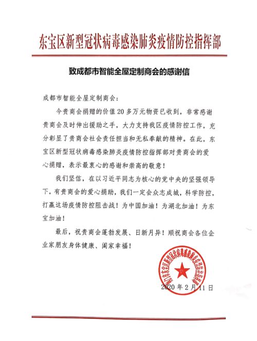 截止2月10日24时,全国确诊的新冠肺炎病例已超过4万例。在全民防控新型冠状病毒肺炎疫情的关键时刻,为助力新型冠状病毒感染肺炎疫情防控工作,成都市智能全屋定制商会发起爱心筹款行动,号召广大会员单位参与爱心捐赠,与疫区共渡难关,并获得了大家的积极响应。