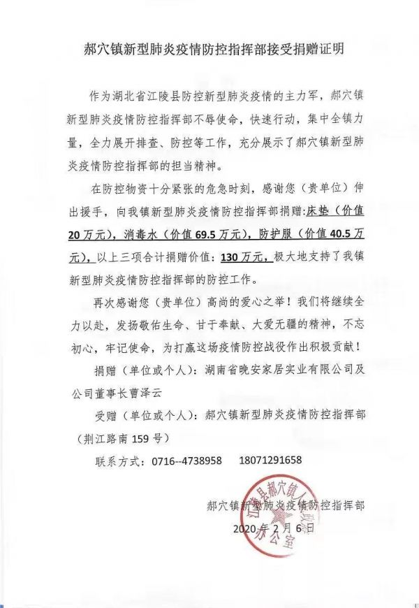 晚安家居也在第一时间迅速成立疫情防控工作领导小组(小组成员:曹泽云、徐庆、陈泽岑、熊龙、刘建平、易辉、林强、李铁刚、高旭升),并启动应急防疫预案,2月6日晚安家居紧急调拨130万元,采购18000瓶75%酒精抗菌液、1000套一次性隔离衣、218张乳胶床垫,助力一线疫情防控工作。