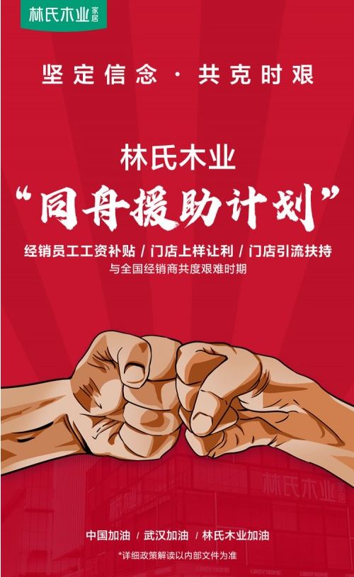 因为疫情,全国经销门店基本都暂停营业了,就算尚在营业的门店也是业绩进展缓慢。为了缓解经销商合作伙伴的销售压力,林氏木业提出“同舟援助计划”,与经销商合作伙伴共渡难关: