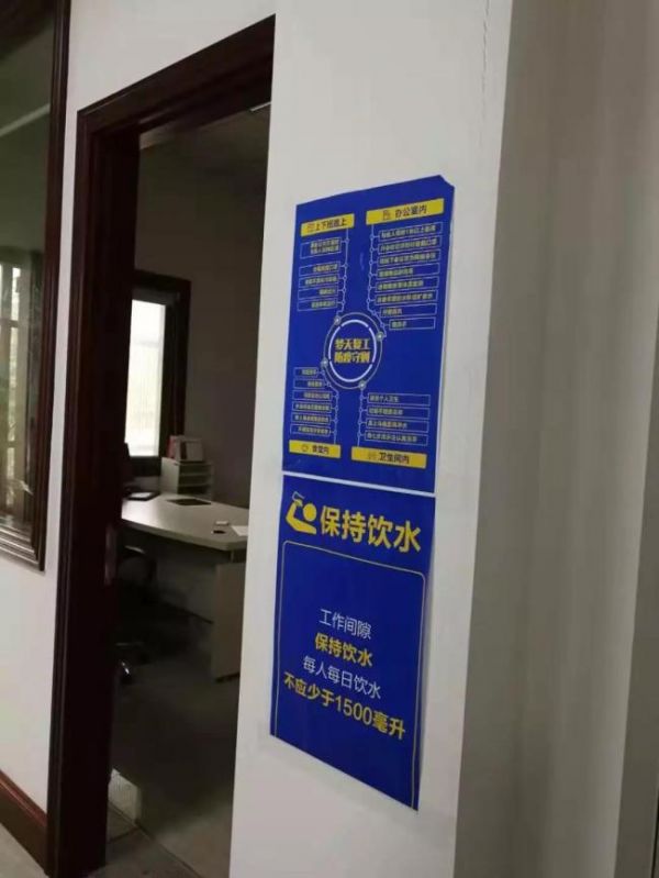 集团疫情防控工作小组也全力做好了复工前后的防疫宣导工作。复工前全员工作群宣导,复工后公共区域与工作场地全面上墙宣导。包括提醒员工保持饮水这样的小细节都宣传到位。
