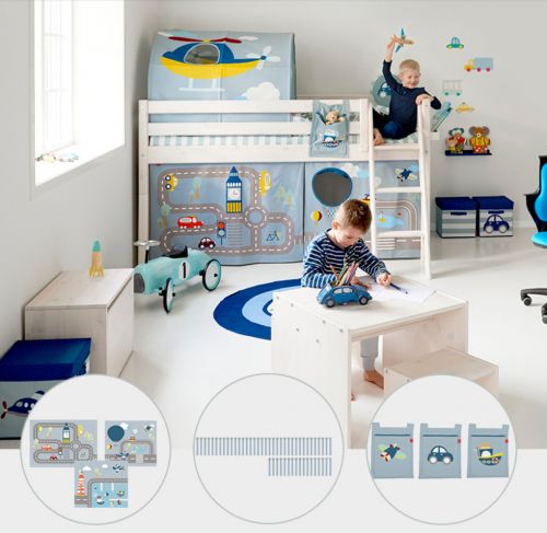 由于体内激素水平不同,男孩大多都活泼好动,充满了侵略、冒险和竞争的天性。他们对交通类、猛禽类、球类、机械类元素具有浓厚的兴趣。纯净与冷静的蓝色,可以缓和男孩子调皮好动的情绪,配合床单上的交通主题图案,仿佛畅游在一望无际的天空。
