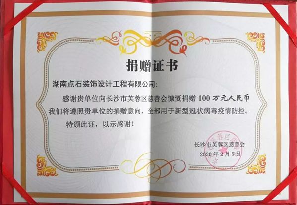 新型冠状病毒感染的肺炎疫情牵动着亿万中国心。为了打好疫情阻击战, 2月5日,点石家装通过长沙市芙蓉区慈善会爱心捐赠100万元人民币,全力支援湖南地区抗击新型冠状病毒感染的肺炎疫情,助力早日打赢这场没有硝烟的战争。