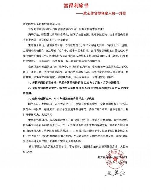 风雨之中,砥砺前行;疫情后前方道路坎坷,富得利必将斩去荆棘,乘风踏势做一家富有社会责任及与经销商互惠互利的地板品牌!