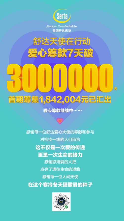 据了解,本次“舒达天使在行动”暖心计划将分为几个周期捐出总价值598万元的2万个乳胶枕用于爱心筹款。在每一个捐赠周期结束后,每周一将汇出上周销售所得,并在“舒达天使在行动”微信小程序活动页面进行公示。首个活动周期里销售所得的184余万元善款将以舒达用户的名义捐给武汉慈善总会,并定向捐给抗疫医院,用于防治疫情。