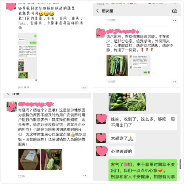 于是,德尔地板上下迅速响应,决定将客户的生活质量关怀放在首位,动员全国各地的德尔人发起了“客户关怀计划”。目前,北京、上海、内蒙、山东、山西、宁夏等很多地区都在开展“送菜上门”服务,目前为止初步估算就有五千余户市民收到新鲜瓜果蔬菜。