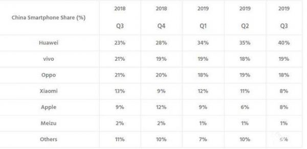 (数据来源:Counterpoint Research,2019年前三个季度国内手机市场份额的占比)