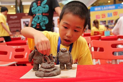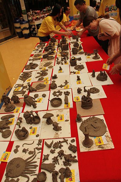 活动一开始,众多小朋友在家长的陪伴下,踩着红地毯,走上签到台。小朋友小的3岁,大的12岁,现场宛如颁奖盛典,星光熠熠。或与“米奇”“维尼熊”合影,或留下自己的画作,或签上自己的大名,或才艺展示,憨萌可人。然后,陶艺老师上台详细为大家讲解如何使用工具,如何施力,如何制作线条等,大家聚精会神的听着。在老师的指导下,家长和孩子们全家老小齐动手,一个个可爱又充满创意的作品渐渐浮现出来:有憨逗的小黄人、威猛的狮子等等。 经过激烈追逐,陶艺师细心的评选,现场产生了一等奖1名,二等奖2名,三等奖三名,并且评选出优秀奖6名。小朋友们上台领取自己的奖品,开心不已。
